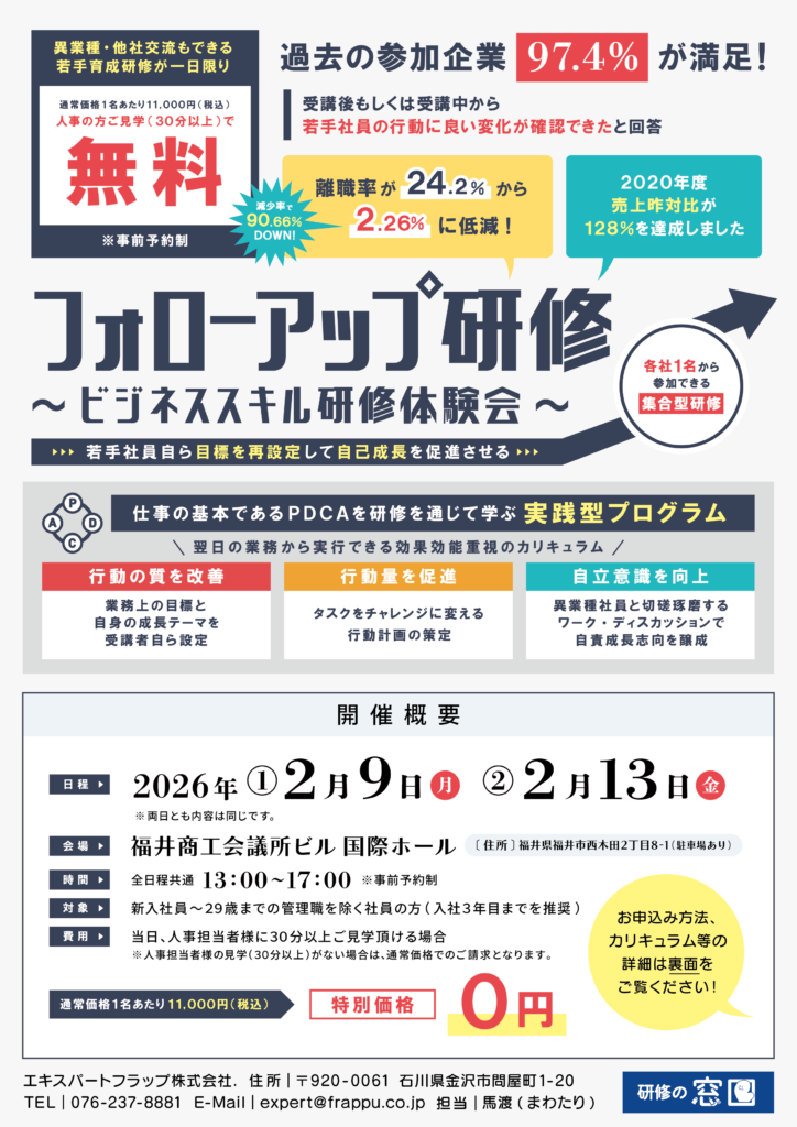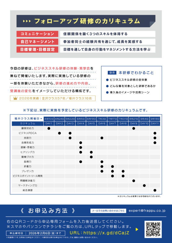 【募集】フォローアップ研修~ビジネススキル研修体験会~(福井開催)のご案内